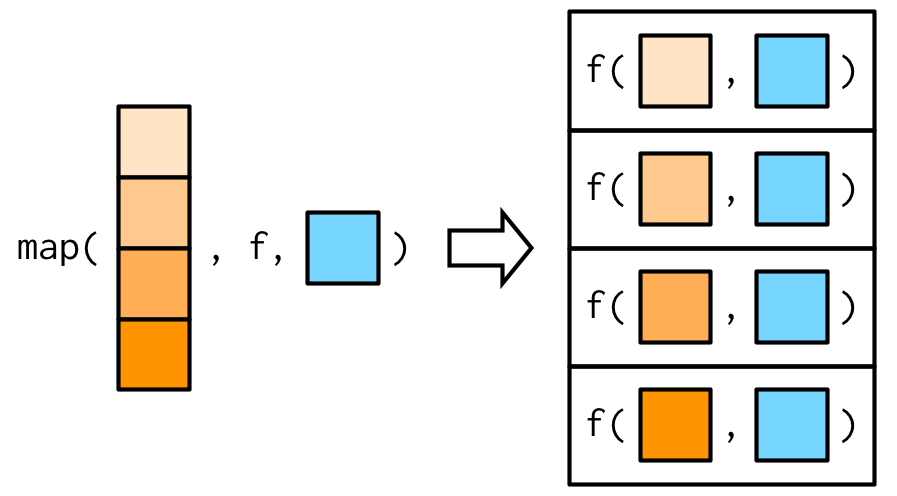 lapply(X, FUN, ...)sapply(X, FUN, ..., simplify = TRUE, USE.NAMES = TRUE)vapply(X, FUN, FUN.VALUE, ..., USE.NAMES = TRUE)rapply(object, f, classes = "ANY", deflt = NULL, how = c("unlist", "replace", "list"), ...)replicate(n, expr, simplify = "array")mapply(FUN, ..., MoreArgs = NULL, SIMPLIFY = TRUE, USE.NAMES = TRUE)eapply(env, FUN, ..., all.names = FALSE, USE.NAMES = TRUE)