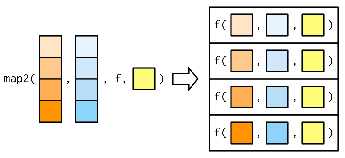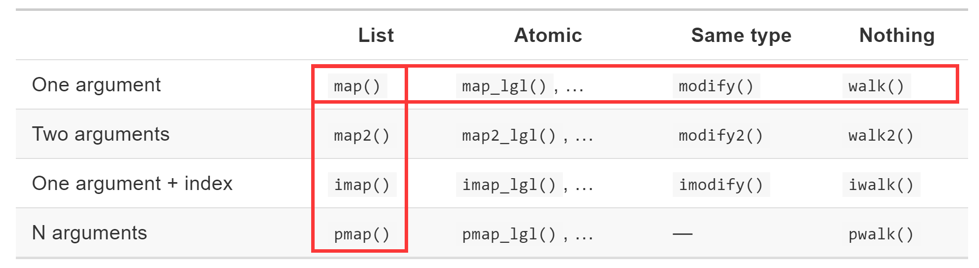 map()、map_*()、modify() 和 walk() 函数的第1个参数 .x 为输入向量(包括原子向量和列表),第2个参数 .f 为函数,第3个参数 ... 为传递给 .f 的额外参数。map()、map_*()、modify() 和 walk() 的返回结果均为与输入向量等长的向量,map() 返回列表,map_*() 返回向量的类由函数名中的后缀决定,modify() 返回与输入向量同类的输出,而 walk() 则不可见地返回输入向量。map2(.x, .y, .f, ...))和多个向量构成的列表 .l(如 pmap(.l, .f, ...)),还可同时应用于向量元素和索引(如 imap(.x, .f, ...))。purrr 包的 map 族函数